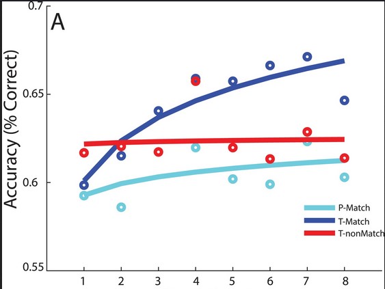 The groups given Alpha wave matched flickers learned to identify the patterns more accurately over the course of the experiment, though their accuracy started out lower than the non-matched group. The non-matched group showed no improvement.