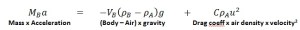 Gravity creates constant downward acceleration. Friction with air produces drag that runs the opposite direction in which one is moving, and is proportional to velocity squared. So the sum of all the forces on Felix, as with any skydiver, during his fall were equal to his mass times his actual acceleration. Since drag is proportional to the square of velocity, the drag force and the gravitational pull become equal, and acceleration reaches zero. This is known as terminal velocity. Not nearly as exciting as the name sounds. I know; I was disappointed, too. In equation form it looks like this: